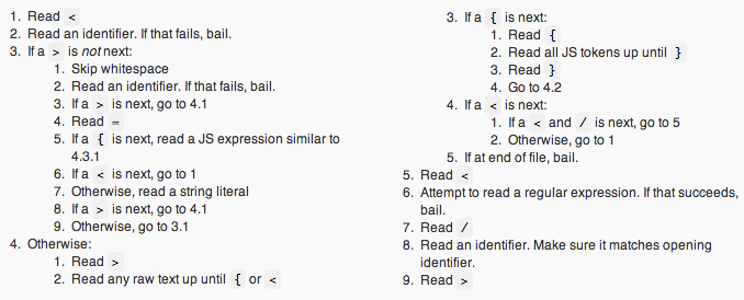Have you ever wondered how JSX was implemented? James Long wrote a very instructive blog post that explains how to compile JSX with Sweet.js using Readtables.
